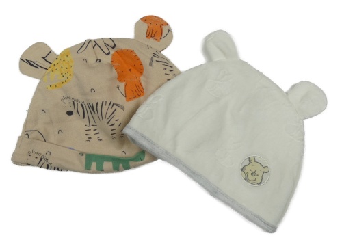 2x čepice - svetlohnedá bavlnená čapica so zvířaty + bílá sametová s Púem