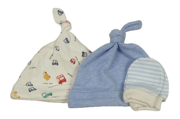 3set - Smotanová bavlnená čapica s auty + modrá melírovaná + bílo-světlemodré pruhované rukavičky