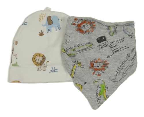 2Set - Biela čapica so zvířaty + šedý slinták s lvíčky