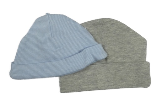2x čepice šedá+ modrá pruhovaná