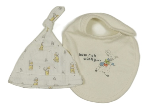 2set- biela čapica s obrázky+ smotanový podbradník s králikom