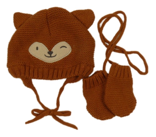 2 set - hnedá pletená čapica s čumákem + rukavice