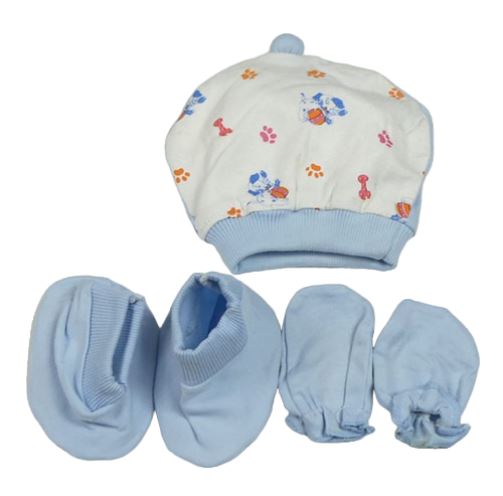 3 set- bielo-modrá čapica s obrázky+ rukavice + cápačky