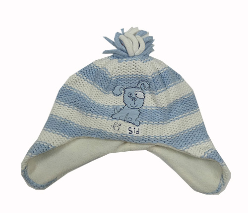 Světlemodro-biela pruhovaná čapica so psem a strapcemi Next