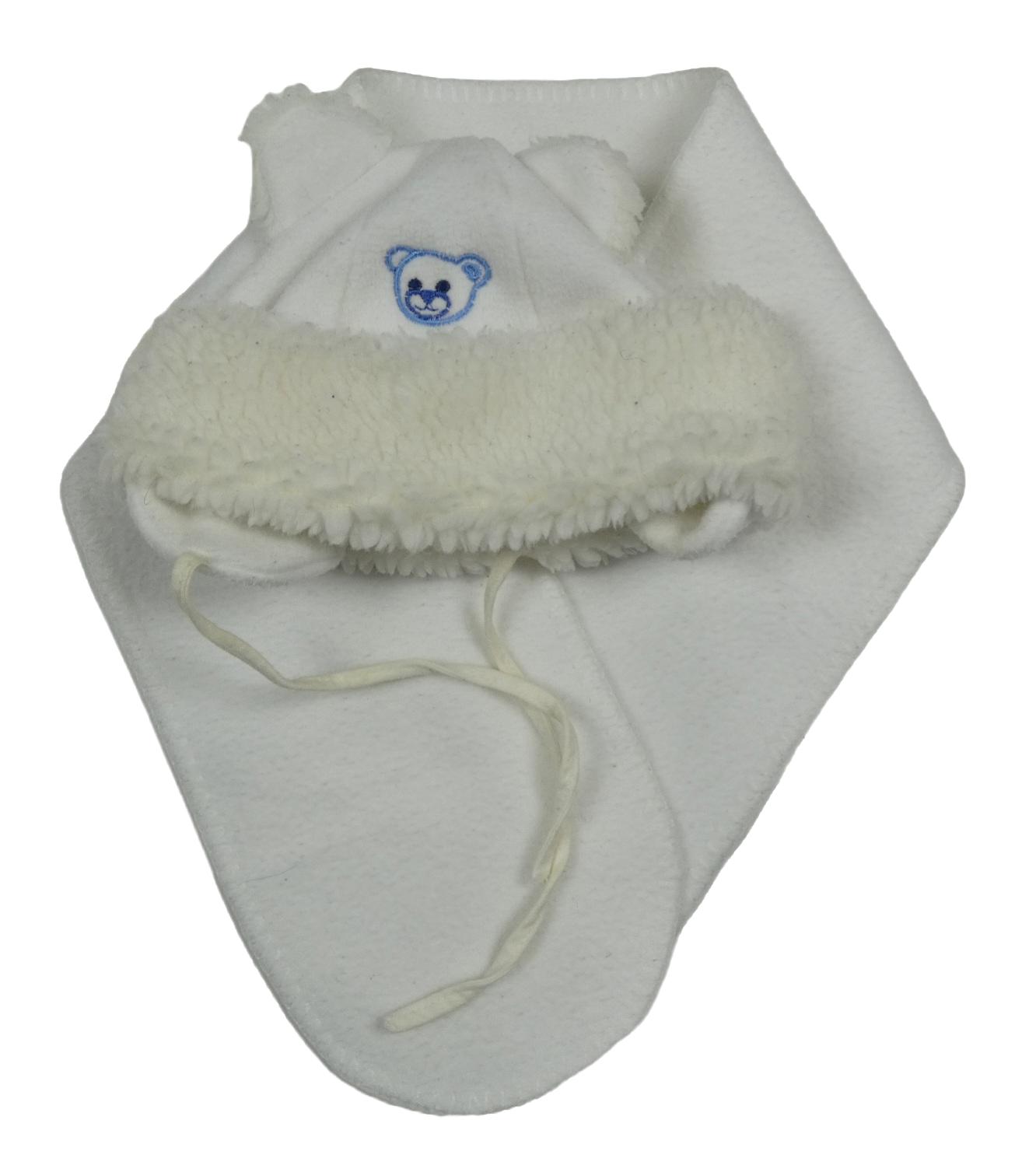 2 set - biela fleecová čapica s medvědem + biela fleecová šál