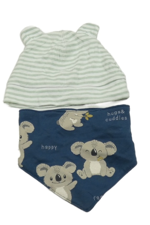 2 set - bílo-zelená pruhovaná čepice + tmavomodrý slinták s medveďmi