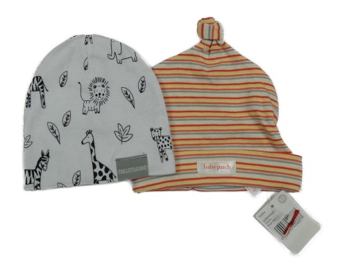 2x bavlněná čepice - biela so zvířaty + barevná pruhovaná