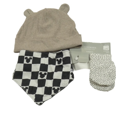 • 3set - Hnedá rebrovaná bavlnená čapica s oušky + černo-světlešedý kostkovaný slinták s Mickyem + smetanové puntíkaté rukavičky
