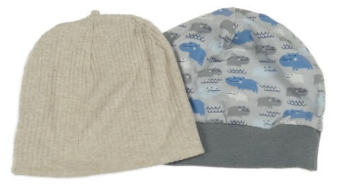 2x bavlněná čepice - béžová žebrovaná + svetlosivá s hrochy