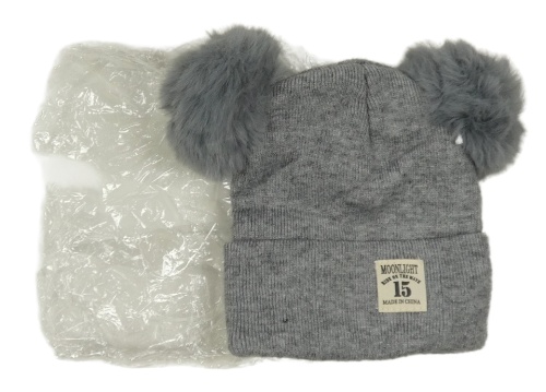 Nová - sivá melírovaná pletená čapica s nášivkou a bambulemi