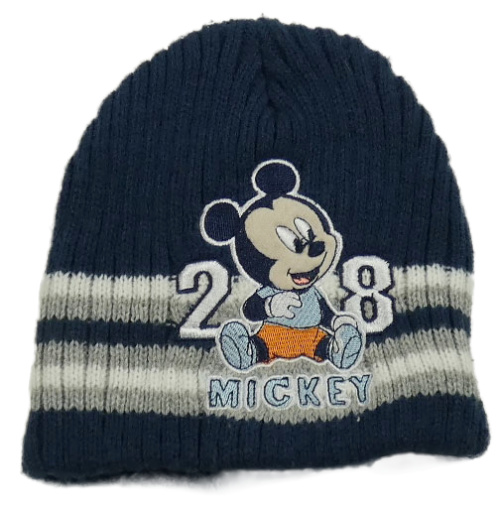 Tmavomodrá pletená čapica s sivymi pruhmi a Mickeym