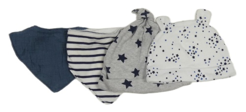 • 4set - Biela bavlnená čapica s hvězdami + šedá melírovaná + tmavomodrý mušelínový slinták + bílo-tmavomodrý pruhovaný