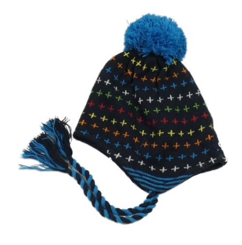 Tmavomodro-farebná vzorovaná pletená čapica s brmbolcom