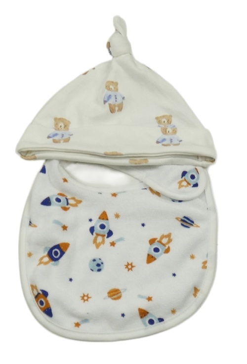 2set - Biela čapica s medvídky + froté podbradník s raketami