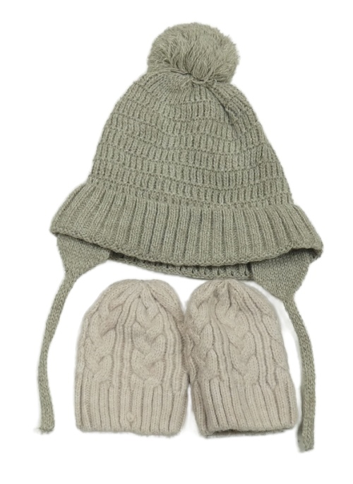 2set - Piesková á pletená čapica s bambulí + béžové vzorované pletené rukavice