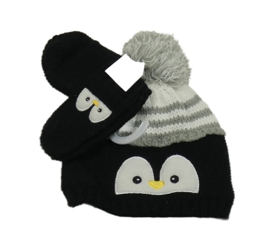Nové - 2 set - čierno-sivá pletená čapica s tučňákem a bambulí + rukavice F&F