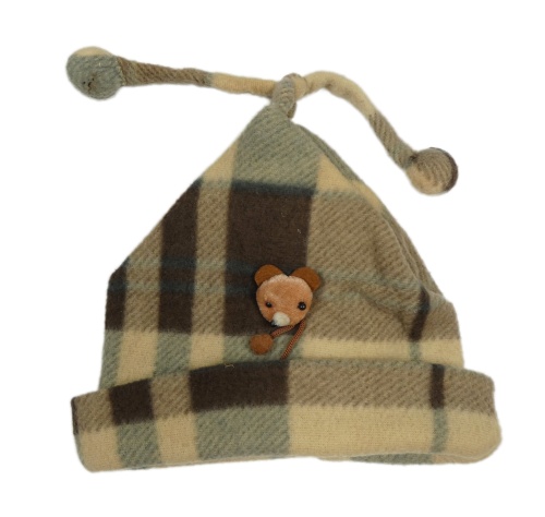 Hnedo-béžová kockovaná fleecová čapica s medvedíkom