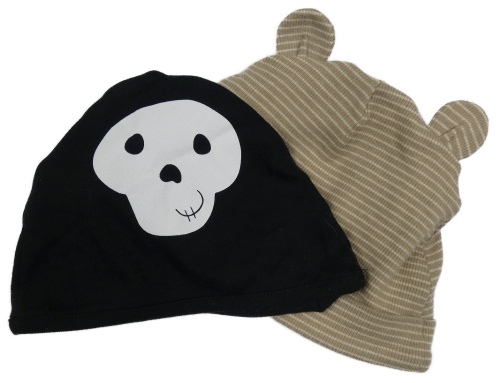 Nové - 2x Béžová pruhovaná čapica s oušky + čierna čapica s lebkou
