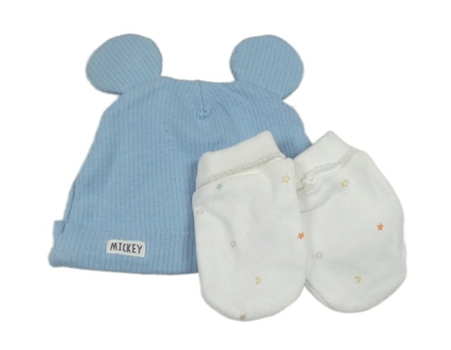 2set - Modrá rebrovaná čapica s oušky + bílé rukavičky s hviezdami