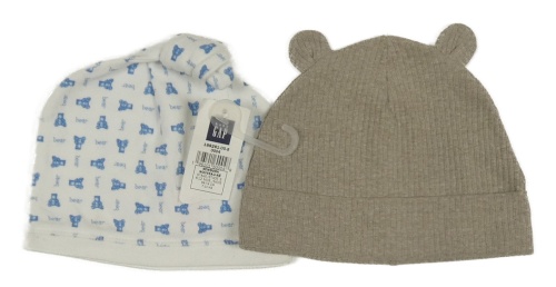 Nové - 2x - Čepice - Biela s medvedíkmi GAP, šedobéžová melírovaná žebrovaná s oušky H&M