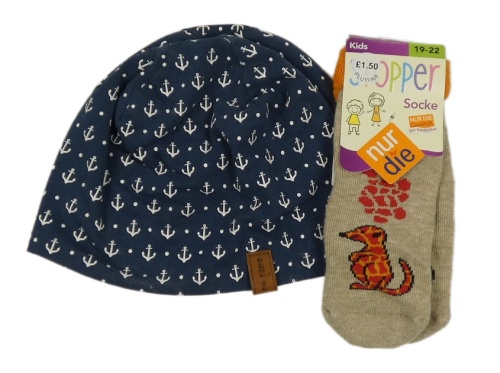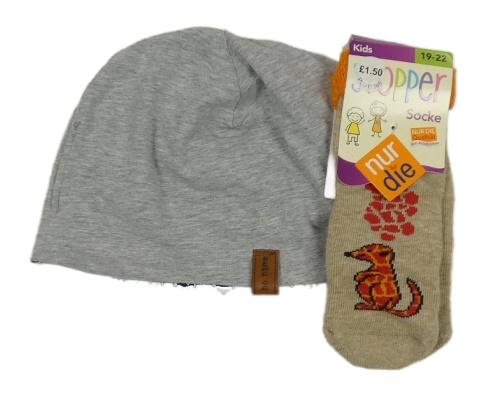 Nové - 2set - Sivá obojstranná čepice + béžovo-červené protiskluzové ponožky so surikatou