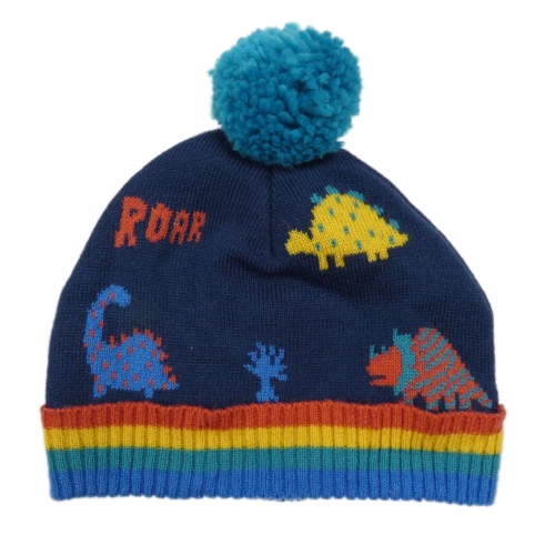 Tmavomodrá pletená čapica s dinosaurami a farebnymi pruhmi a brmbolcom M&S