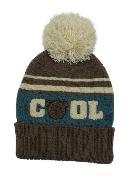 Hnedo-béžovo-modrá čapica s nápisom a brmbolcom