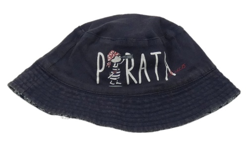 Tmavomodrý plátenný obojstranný klobúk s nápisom a pirátem