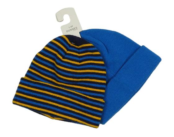 Nové - 2x čepice - modrá + tmavomodro-modro-žltá pruhovaná čapica Dunnes