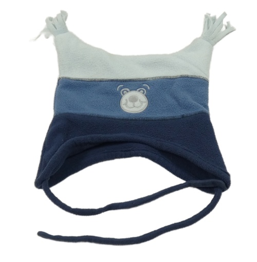 Tmavomodro-modro-světlemodrá pruhovaná fleecová ušanka s medvedíkom
