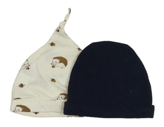 2x čepice - smetanová bavlnená s ježky + tmavomodrá žebrovaná