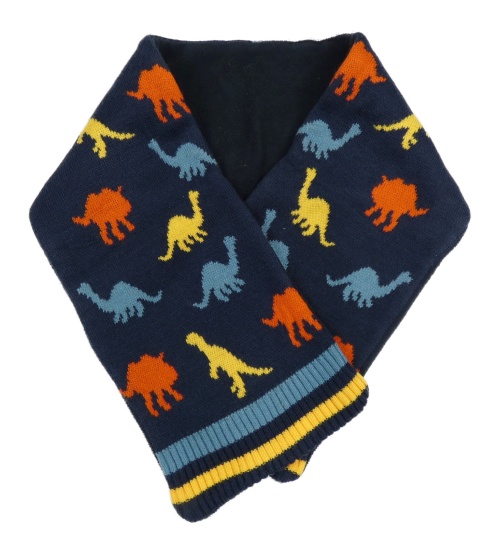 Tmavomodrá pletená podšitá šál s dinosaurami a pruhmi