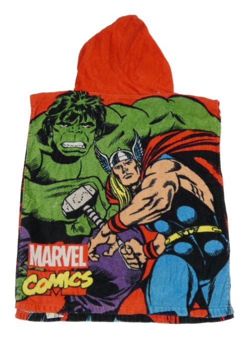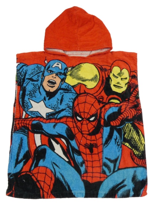 Červené froté osuškové pončo s hrdinami a kapucňou