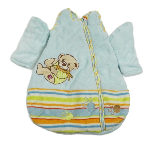 Světlemodro-barevný chlupatý zateplený spací pytel s medvěďom a pruhmi