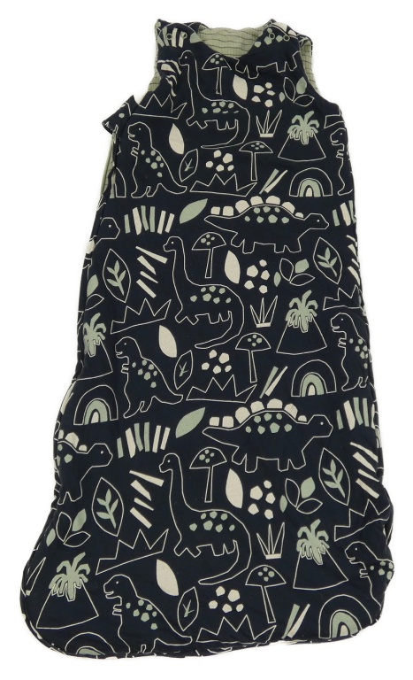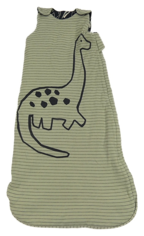 Zelenošedý pruhovaný žebrovaný zateplený oboustranný spací pytel s dinosaurom