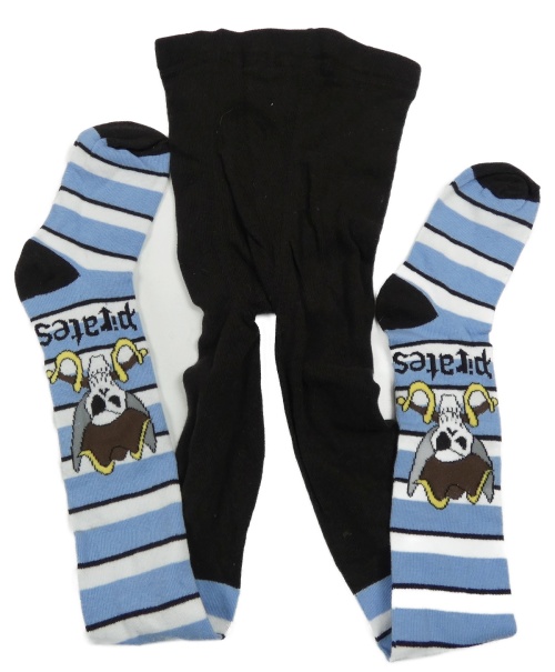Tmavohnědo-modro-biele pančuchy s pruhmi a lebkami
