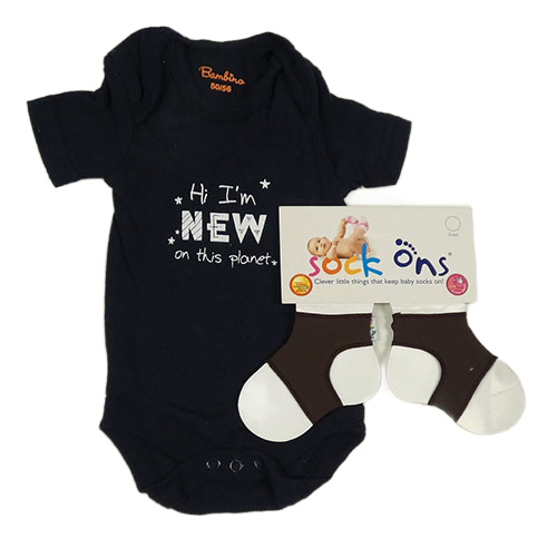 Nové - 2Set - Tmavohnedé držáky ponožek + tmavomodré body s nápismi Bambino