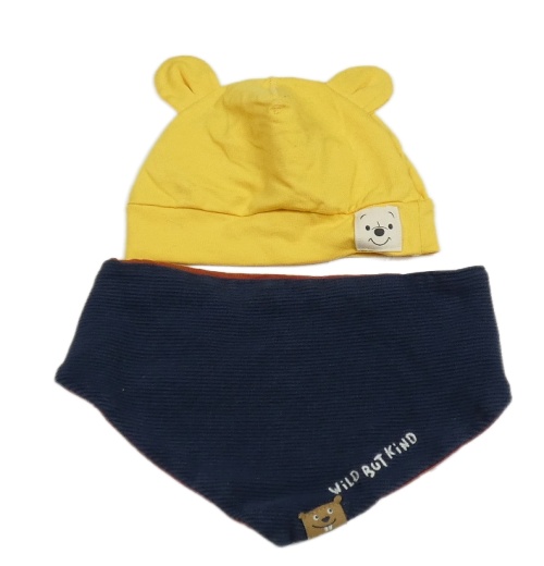 2set - žltá čapica s oušky + tmavomodrý žebrovaný slinták s nápisom