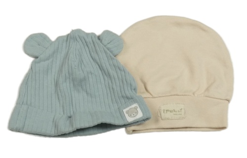 2x čepice - šedomodrá žebrovaná + svetlobéžová s nášivkou