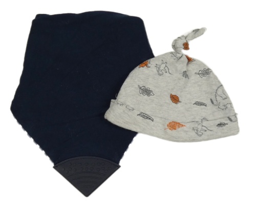 2set - Sivá čapica s listy + tmavomodrý slinták s kousátkem