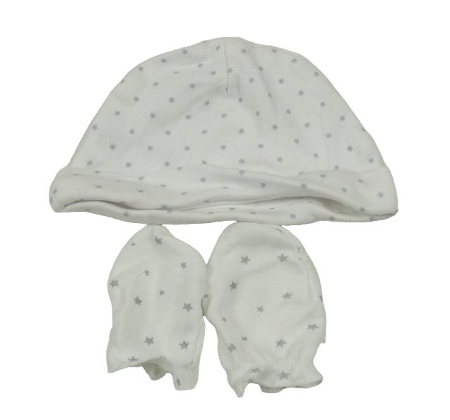 2 set - biela čapica s modrými hvězdičkami + rukavice George