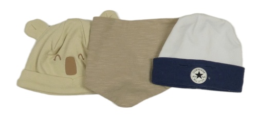 3 set - béžový slinták + smotanová čapica s Púem + bielo-modrá čapica Converse