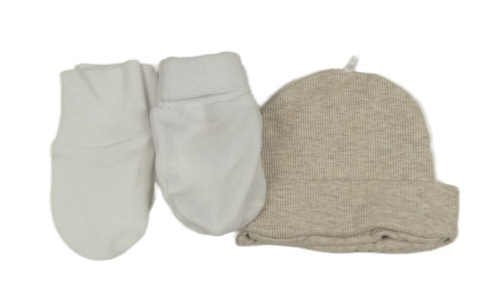 3 set - béžová žebrovaná čepice + 2x bílé rukavice