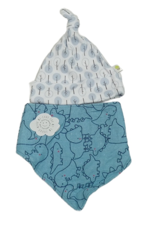 Nové - 2set - Biela čapica s stromečky + modrý slinták s dinosaurami
