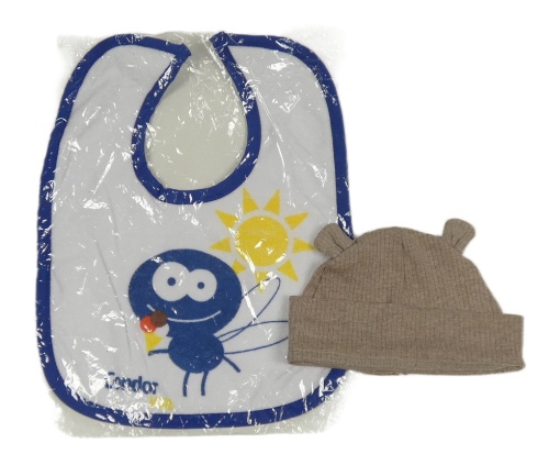 2set- béžová čapica s oušky+ bielo-modrý podbradník s broučkem