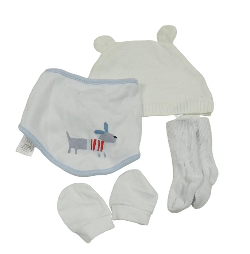 4 set - bílý slinták s pejskem + úpletová čepice + ponožky + rukavice