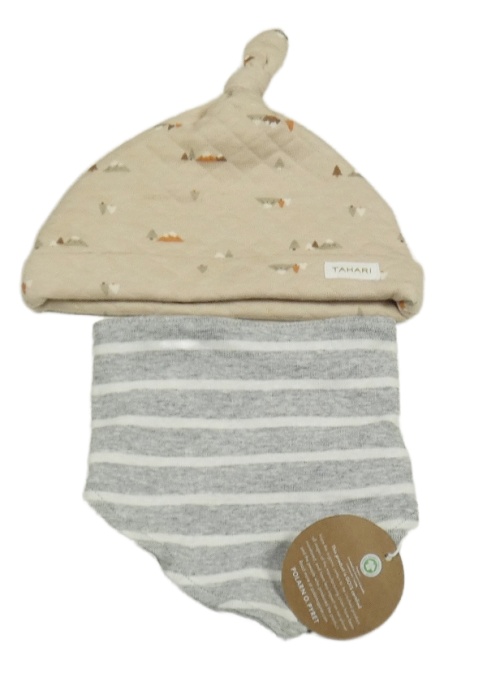 2 set - sivý pruhovaný slinták + béžová vzorovaná čapica