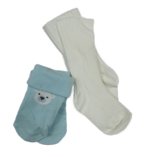 2x ponožky - smetanové žebrované + světlemodré s medvěďom