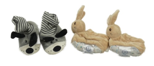2x plyšové capáčky - béžové so zajíčky + šedé s oslíky