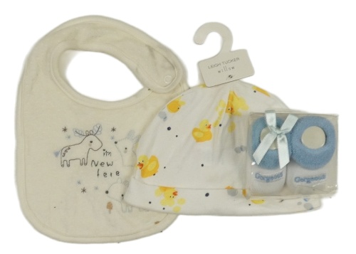 Nové - 3 set - smotanový bryndák + biela čapica s kachničkami + biele ponožky s modrým lemem